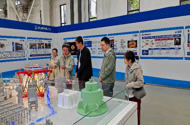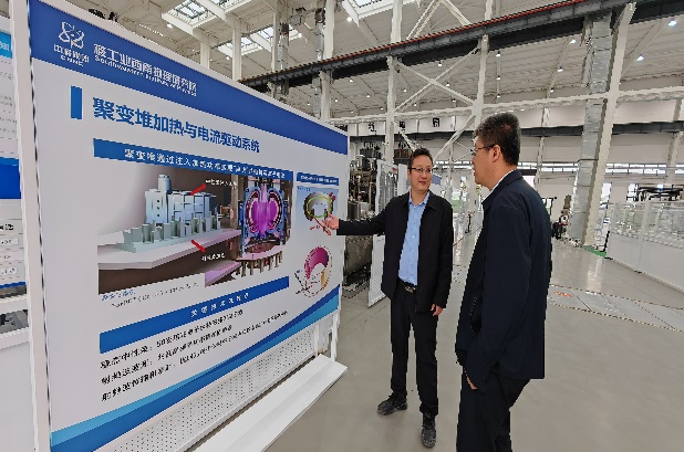 黄文会一行首先参观了西物院核聚变技术研发基地,张龙和白兴宇介绍了西物院聚变大装置及配套科研台架建设情况、聚变技术研发基地整体规划及建设进展。